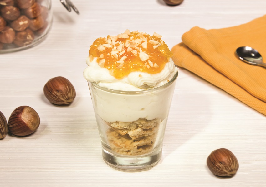 Peste crema puneţi o lingura de gem de pere. La final, presarati alunele macinate deasupra.