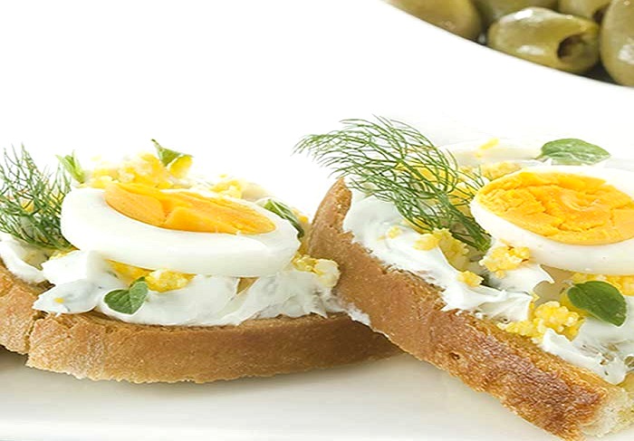 Ungeti cele 4 felii de paine prajita cu compozitia obtinuta. Feliati cele doua oua ramase si puneti-le peste compozitia de mascarpone.