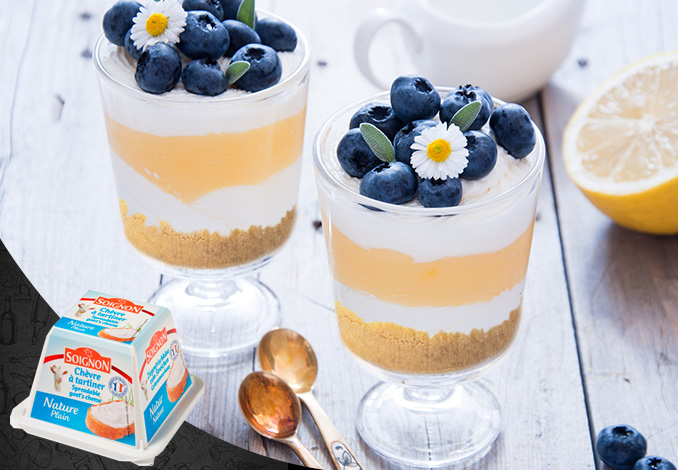 Aranjează în pahar alternativ un strat de pandișpan, un strat de cremă de lămâie, afine și un strat de amestec cu brânza de capră. Repetă procesul și finalizează decorul cu afine și frunze de mentă.