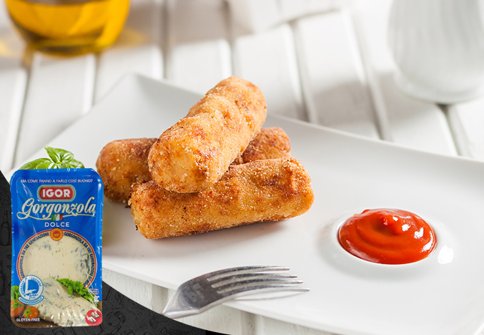 Tăiați gorgonzola în cuburi mici. Formați crochetele luând o bucățică din compoziția de mai sus, formând o gaură și introducând câte un cub de brânză în interior. Treceți crochetele obținute prin pesmet.