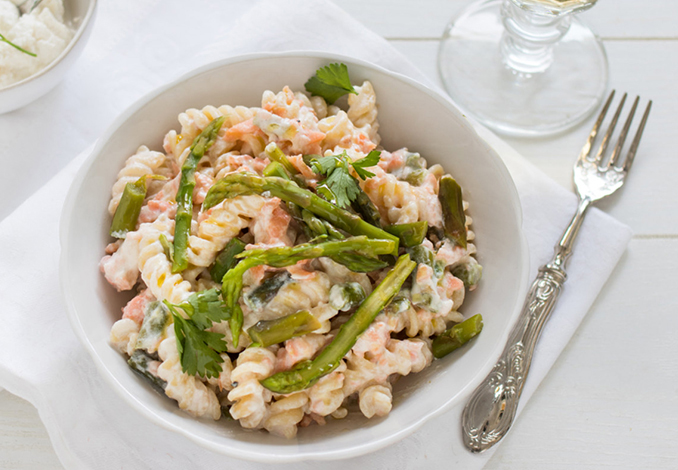 Pentru prepararea sosului, fierbeți sparanghelul în apă sărată, strecurați-l și tăiați-l în bucăți mici. Amestecați ricotta de la Granarolo cu parmezan ras de la Zanetti. Tăiați somonul în fâșii.