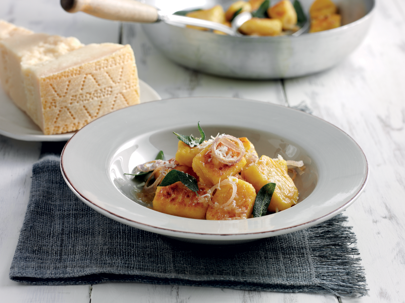 Separat, topiti untul cu ceapa rosie. Adaugati untul topit si ceapa rosie peste gnocchi, presarati restul de Grana Padano ras si decorati fiecare farfurie cu o frunza crocanta de salvie.