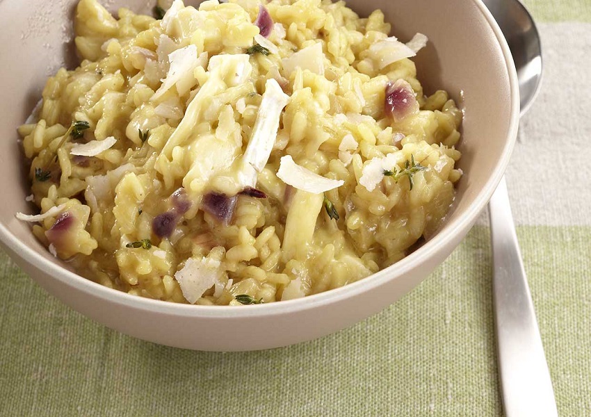 Dupa ce a fiert orezul, reglati flacara aragazului la mediu si adaugati treptat cele doua branzeturi feliate amestecand usor. Opriti focul si acoperiti orezul timp de 3 – 5 minute, pana cand se va topi branza. Adaugati sare si piper si serviti preparatul cald.