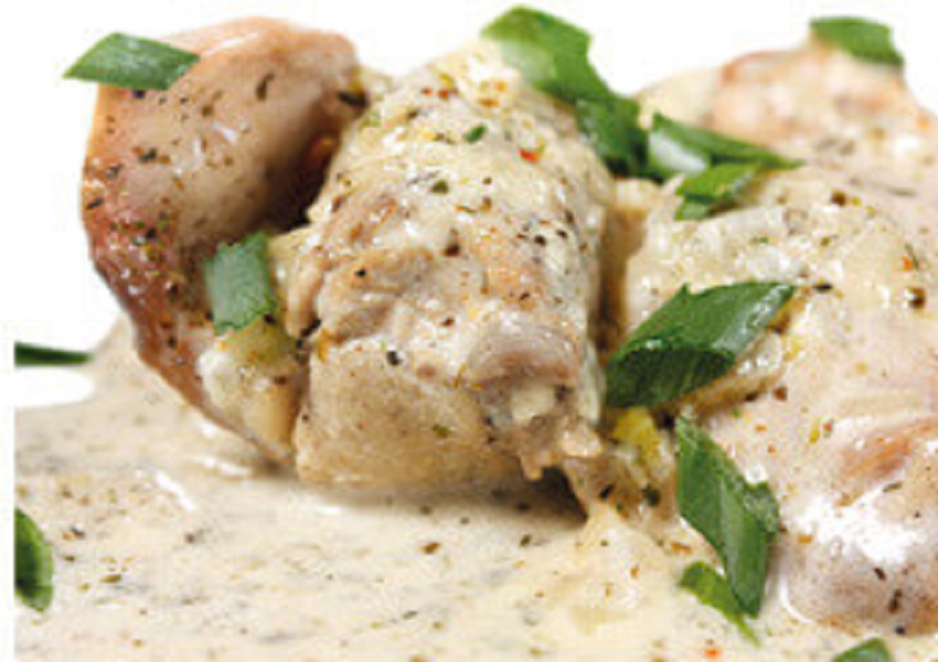 Serviţi-le pe un pat de salată proaspătă, adăugând un sos obţinut din lichidul de coacere amestecat cu puţină Gorgonzola dulce