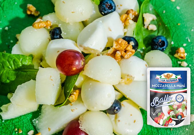 Gândul îți este la mare, vremea este minunată, dar lista de mâncăruri ușoare e pe terminate? No problem, suntem aici să te ajutăm. Îți propunem o salată ușoară cu fructe, Mozzarella mini de la Casa Azzurra și nuci delicioase.