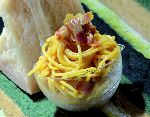 Amestecați spaghetele în tigaie cu baconul și încorporați amestecul de ouă. Încălziți ușor câteva momente, încercând să evitați ca oul să se transforme în omletă. Ar trebui să aibă un aspect cremos.