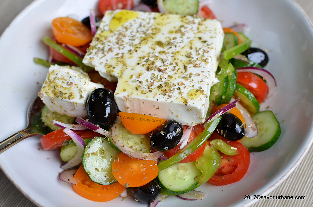 Salata greceasca reteta traditionala. O salata de vara compusa din rosii, branza feta, castraveti, ceapa, ardei si masline. Este numita si salata horiatiki (rustica, taraneasca) si isi are originile in Grecia.
